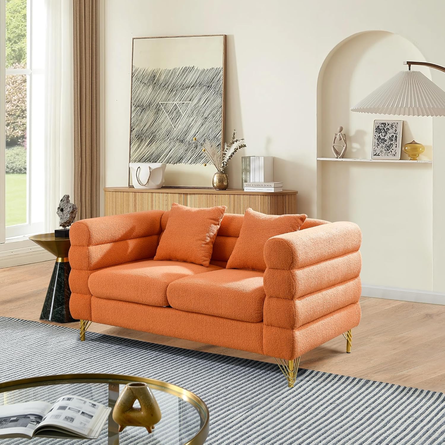 Phirkcraft Modern Teddy Loveseat Sofa, 60 Inch Sectional Sofa Couch, Luxury 2 Seater Deep Couch with 2 Pillows and Gold Metal Legs for Living Room, Bedroom, Apartment